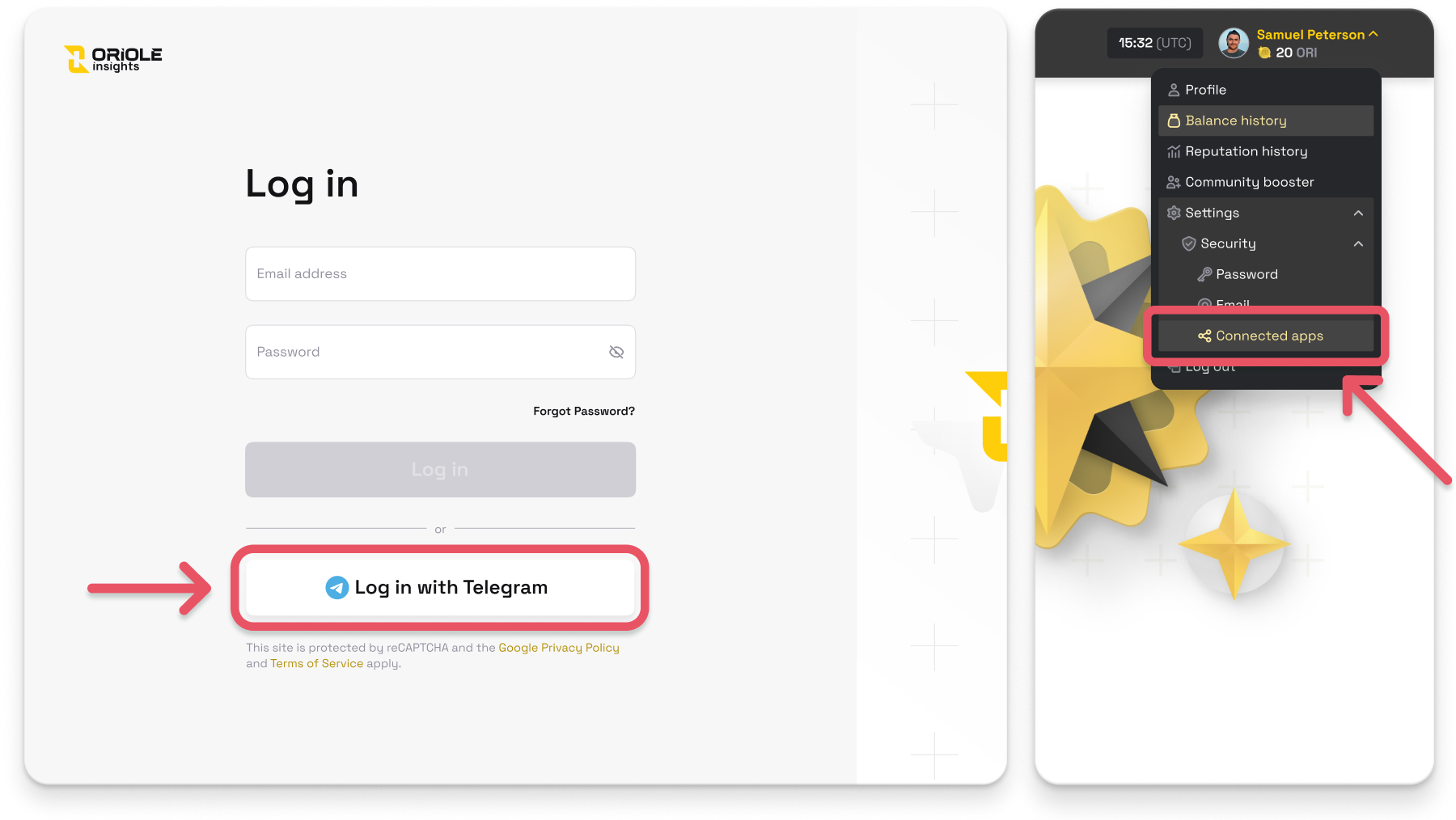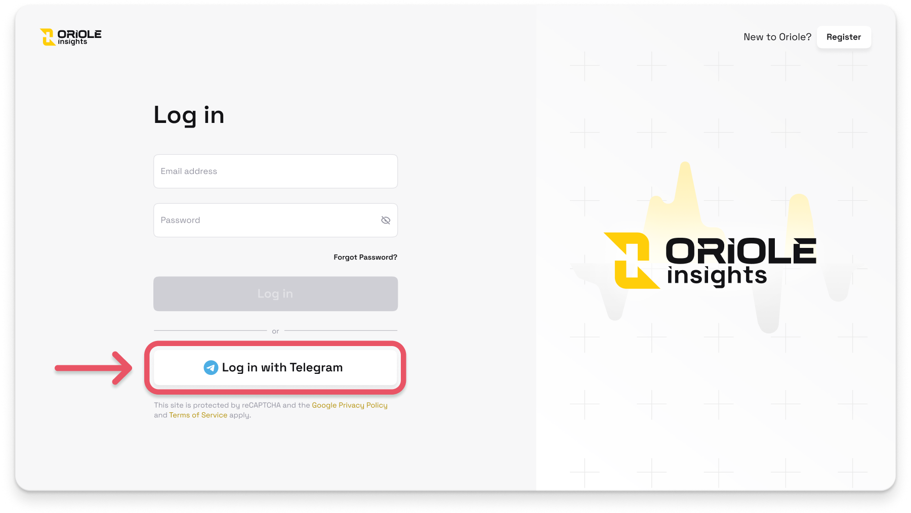 * **Existing Users (with a Web account)**: Simply log in via **Telegram** using the same credentials to sync your **Mini App** with your **Oriole Insights account.**