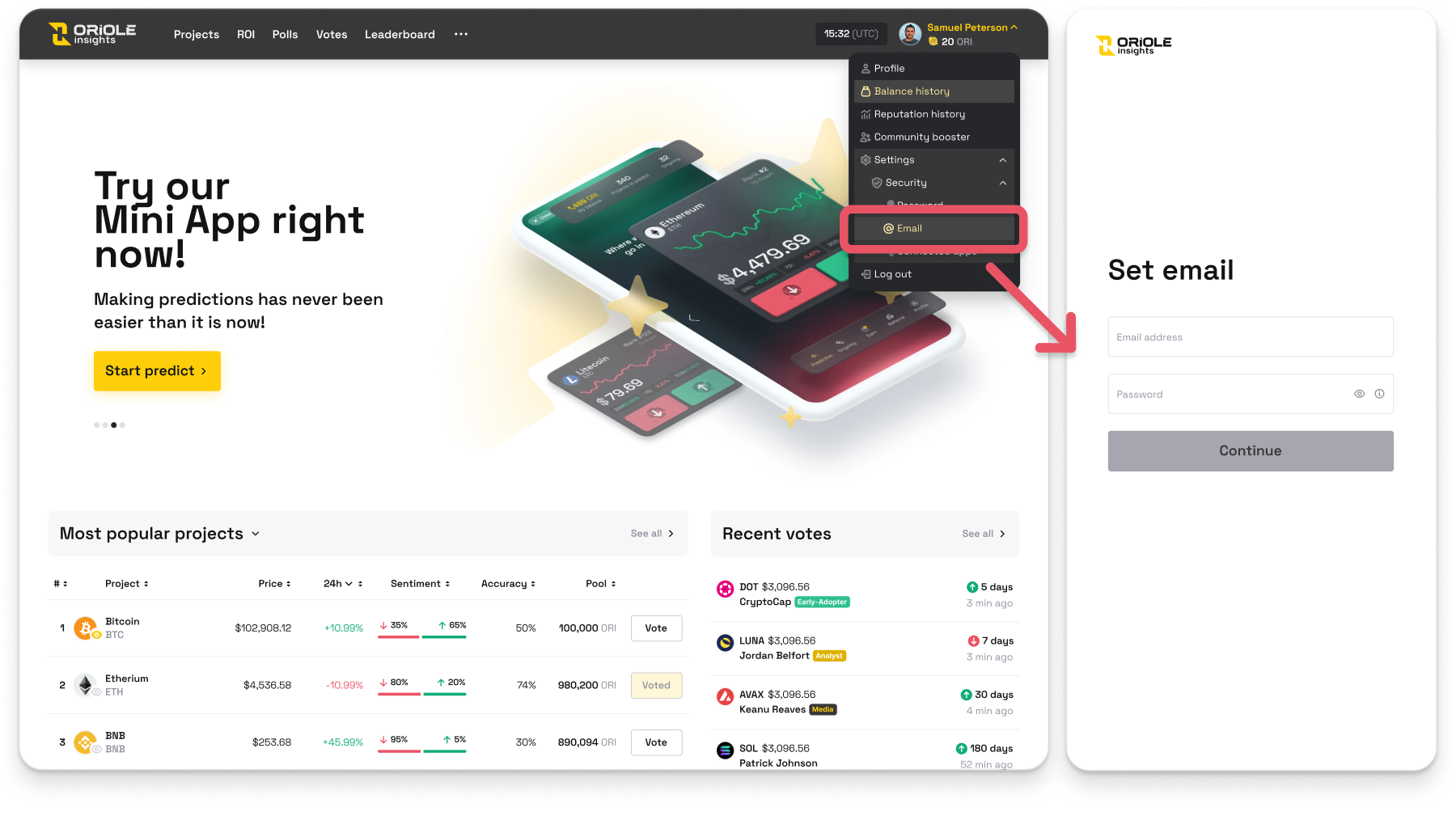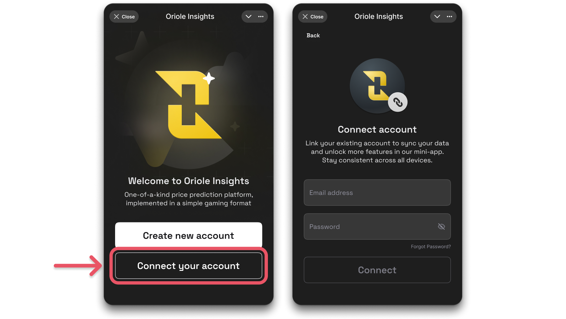 Oriole Insights Mini App lets you make quick UP/DOWN predictions, track rewards, and sync your account seamlessly between Telegram and our web platform. Whether you're a new or existing user, follow the steps below to connect your profile.